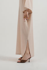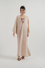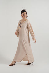Beige Kaftan and Cream Inner Blouse in Silk, Accented with a V-Neckline, Gold Embellishments, Signature Print, and Mid-Thigh Slits, Creating a Luxe and Graceful Ensemble.