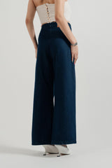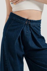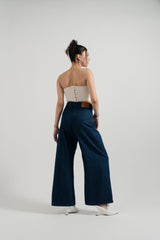 Blue Cotton Denim Flared Pants with a High Waist, Front Pleats, and Adjustable Hook Fastening. A Timeless Silhouette Reimagined for Modern Dressing.