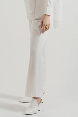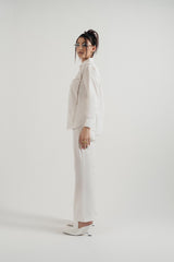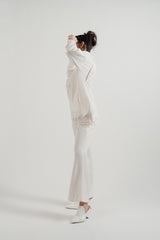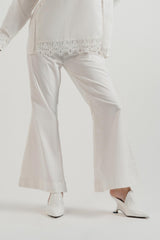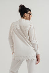 Off White Twill Shirt, Featuring a Half Button Placket, Point Collar, Cuff Sleeves, Curved High Low Hem, and Lace Detailing. Paired with Flared Pants, it is a Refined Staple that Blends Feminine Charm with Everyday Ease.