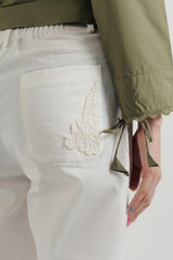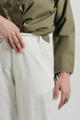 Off White Twill Pants with a Semi-Elastic Waistband, Hook-and-Zip Closure, and Lace Accents. Functional with Versatile Appeal.