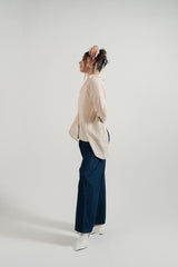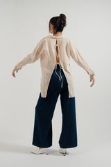 Beige Linen Shirt with Point Collar, Button Closure, and Elongated Back with Slit Tie Detail. A Relaxed Wardrobe Staple with Charming Details.