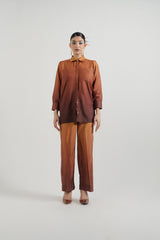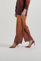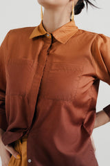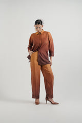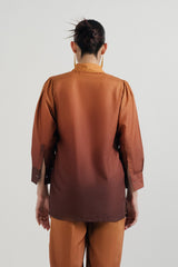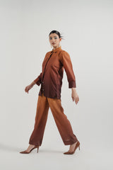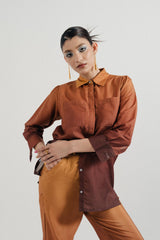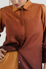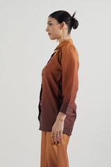 Experience the allure of cascading ombré tones in this vibrant silk co-ord, tailored with full sleeves, chest pockets, and high-waisted flared pants. A statement ensemble that captures both movement and modern elegance.