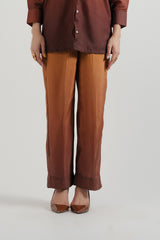 Tumeric Yellow Co-Ord Set in Silk, Defined by an Ombre Print Shirt with Chest Pockets, Full Sleeves, and Buttoned Cuffs, Paired with High-Waisted Flared Pants with a Semi Elastic Waistband for a Bold and Contemporary Finish.