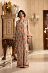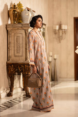 Beige Printed Kaftan Crafted from Soft Maple Silk, Featuring a Flowing Silhouette and Elegant Print Details.