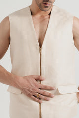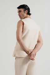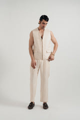 This off-white set blends clean lines with effortless wearability. The waistcoat and coordinating trousers create a sleek, contemporary silhouette, while the versatile design allows for layering over shirts or under jackets, making it ideal for elevated casual or smart-casual styling.