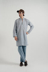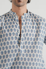 Regular Fit Kurta in White and Blue Print, Made from 100% Cotton. Featuring Full Sleeves, a Band Collar, Button Closure, and Two Side Pockets, it lends Effortless Movement to a Heritage-Inspired design.
