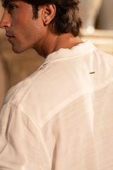 Tailored White Top Crafted from a Soft Irish Cotton-Linen Blend, Featuring a Clean Silhouette and Minimalist Detailing for a Sophisticated Everyday Look.