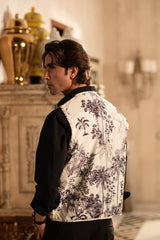 Tailored off-white waistcoat in maple silk with signature sublimation print for a refined, modern look.
