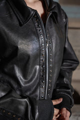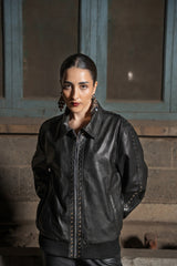Black Genuine Leather Jacket with a Classic Collar, Full Sleeves, Zip-Front Fastening, Welt Pockets, Full Lining, and Stud Detailing on the Front and Sleeves.