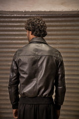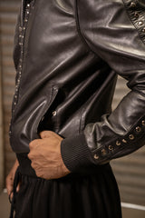 Black Genuine Leather Jacket Featuring a Classic Collar, Zip-Front Fastening, Welt Pockets, and Stud Detailing on the Front and Sleeves. Fully Lined for Comfort and Durability.