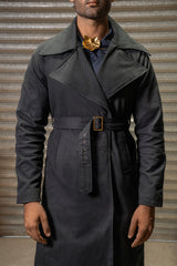 Navy Blue Cotton Twill Trench Coat with a Peaked Lapel, Double-Breasted Button Closure, Knee-Length Silhouette, Welt Pockets, and a Waist Tie Belt with Buckle Fastening.