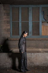 Black & Chocolate Brown Leather Shacket Featuring Full Snap-Buttoned Sleeves, Concealed Snap-Front Fastening, Classic Collar, Full Lining, and a Chest Pocket.