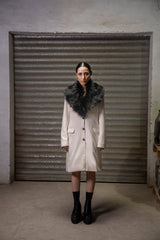 White Wool Coat with Full Sleeves, Single-Breasted Three-Button Closure, Full Lining, Two Front Flap Pockets, and a Detachable Black Fur Lapel.