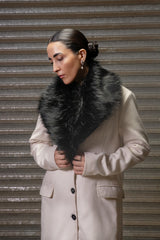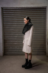 Layer your winter outfits with the Sheen Wool Coat, a luxurious blend of soft structure and plush detailing. The detachable fur lapel adds a glamorous dimension, while its knee-length silhouette keeps the look refined and effortlessly elegant.