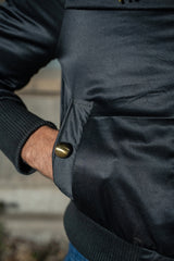 Black Satin-Leather Bomber Jacket with a Wing Collar, Zip Fastening, Gold Brass Embellishments, Welt Pockets, Full Lining, and Cone-Style Ribbed Cuffs.