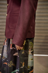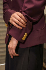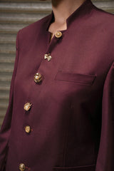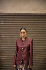 Plum Silk-Blend Jacket with a Band Collar, Full Sleeves, Button Closure, Full Lining, and Gold Brass Embellishments on the Front and Sleeves.