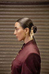 Step into refined winter elegance with the Zarafshan Plum Jacket, a structured silhouette elevated by gold brass embellishments. Its rich plum tone and tailored finish create a look that feels powerful and regal.